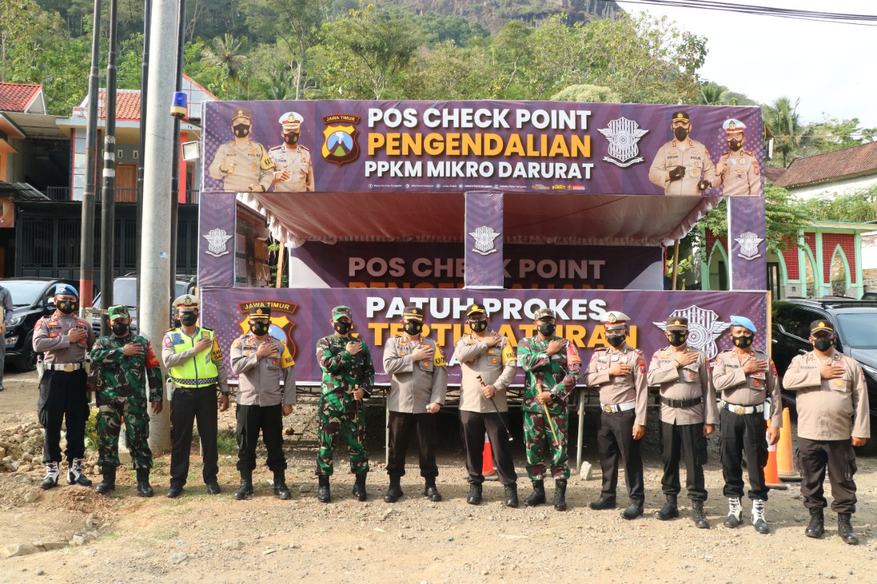 Ponorogo - beritaplus.id | Di hari ke enam belas PPKM Darurat, Kapolres Ponorogo bersama Dandim 0802 dan PJU turun langsung melaksanakan pengecekan di Pos Penyekatan Wilayah Kecamatan Sawoo yang berbatasan Kabupaten Kabupaten Trenggalek, Minggu (18/7/2021).
