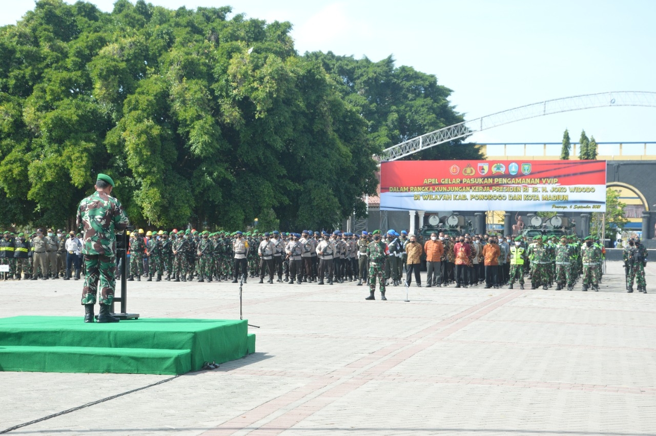 Apel gelar pasukan pengamanan VVIP dalam rangka Kunjungan Kerja (Kunker) Presiden RI tersebut dipimpin langsung oleh Komandan Korem 081/Dsj, Kolonel Inf Waris Ari Nugroho, SE., M.Si dan diikuti oleh TNI, Polri dan Pemkab. Ponorogo.