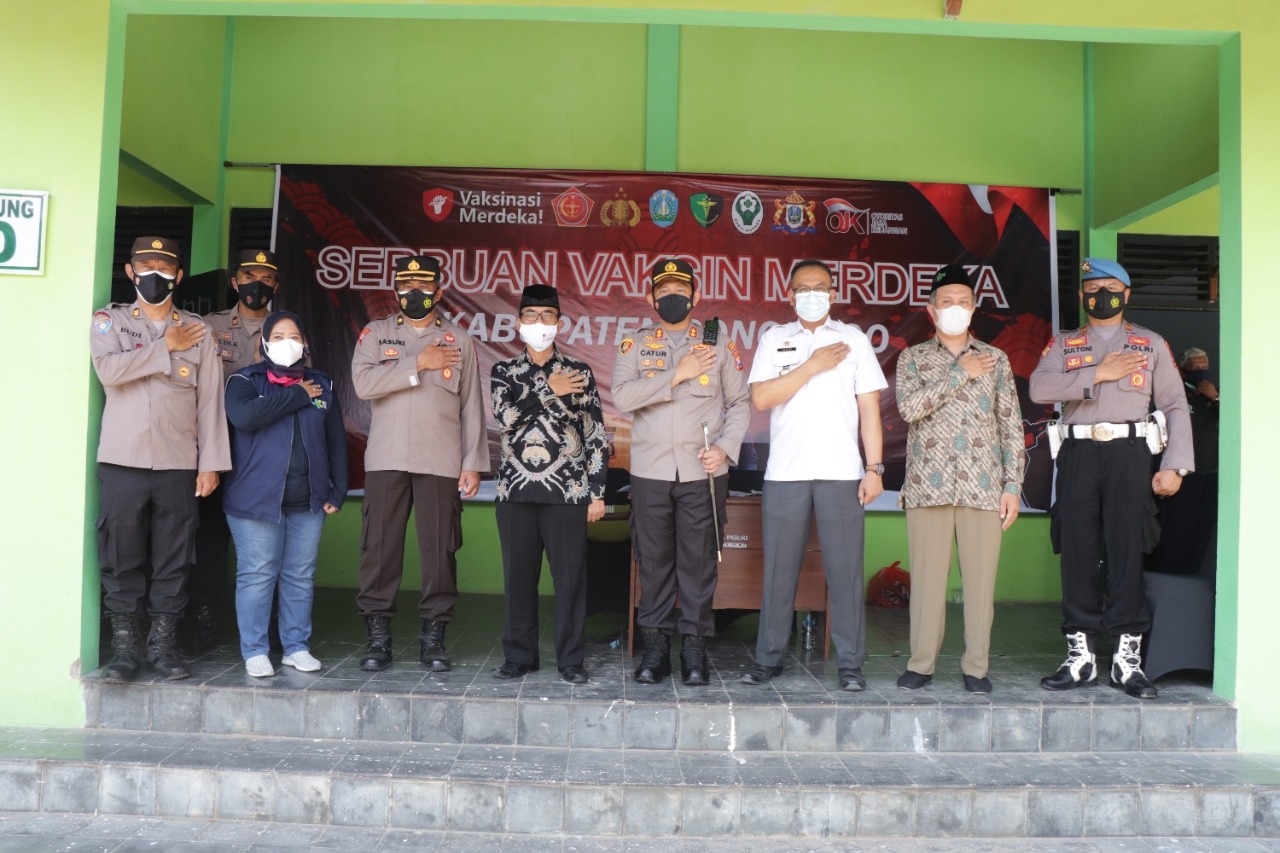 Kegiatan Vaksinasi yang dimulai pukul 08.00 hingga Pukul 14.00 WIB dengan target 2000 Dosis I ini, sebagai bentuk dukungan penuh serta sinergitas TNI Polri dan Pemda Ponorogo.