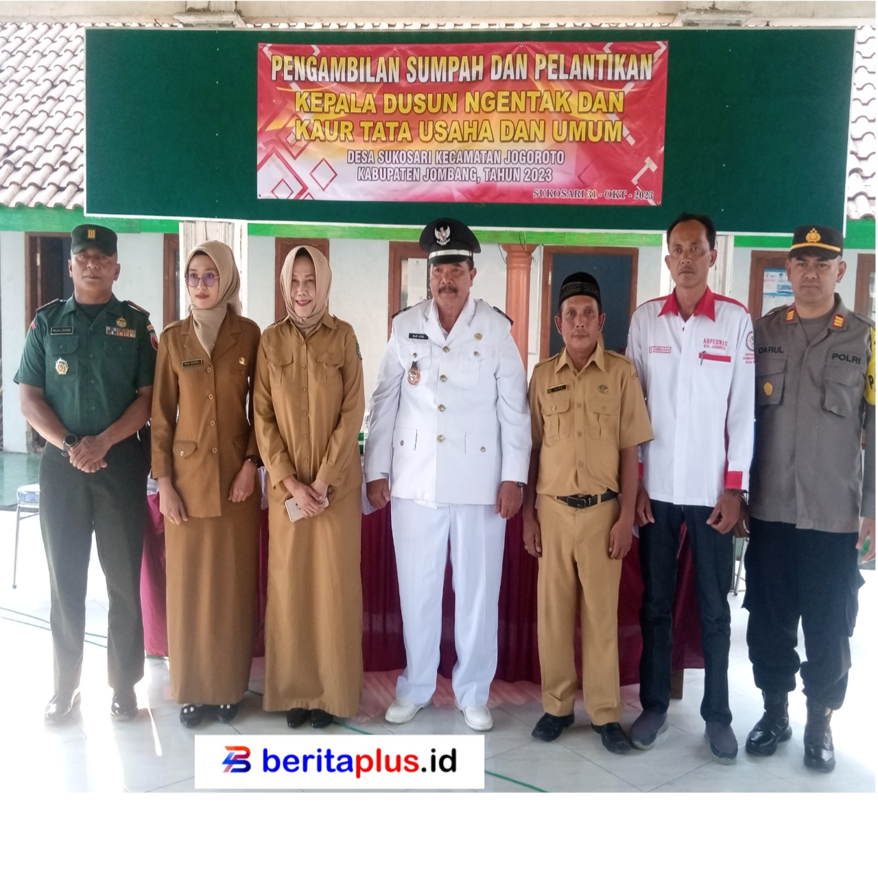 Jombang - beritaplus.id | Drs. H. Nurjono Kepala Desa ( Kades ) Sukosari, Kacamatan Jogoroto melantik dan megambil sumpah jabatan dua perangkat desa, Sueb sebagai Kepala Dusun Ngentak bersama Yesky Wahyu Angraini sebagai Kaur Tata Usaha dan Umum di pendopo balai desa setempat, Selasa ( 31/10 ).