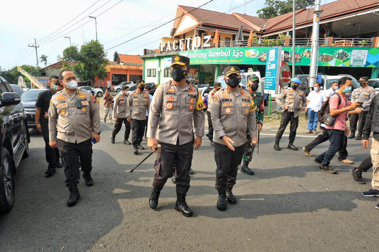 Surabaya - beritaplua.id | Usai melakukan pengecekan di pos penyekatan Sidoarjo, Kapolda Jawa Timur bersama Pejabat Utama Polda Jatim kembali melakukan pengecekan di wilayah Pacet Mojokerto, sekaligus menghimbau kepada anggota di Mojokerto untuk melakukan pengamanan di tempat wisata dan pasar, hal ini dilakukan guna menekan angka penyebaran Covid-19 di Jatim Pasca lebaran.