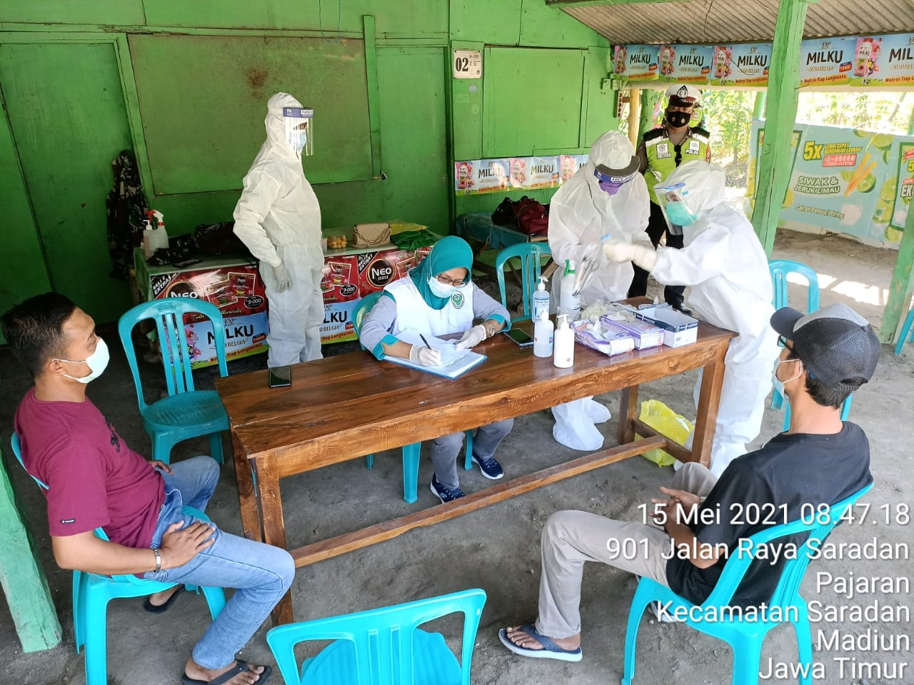 Tampak dilapangan, petugas gabungan yang ada di pos penyekatan melakukan Rapid Antigen puluhan masyarakat yang keluar wilayah Kab. Madiun, pasalnya mereka tidak bisa menunjukkan surat bebas Covid-19. "Kita optimalkan keberadaan petugas gabungan di pos penyekatan, kurang lebih sudah ada 15 orang yang kita Rapid test namun hasilnya negatif, apabila ada yang positif maka langsung dikarantina,