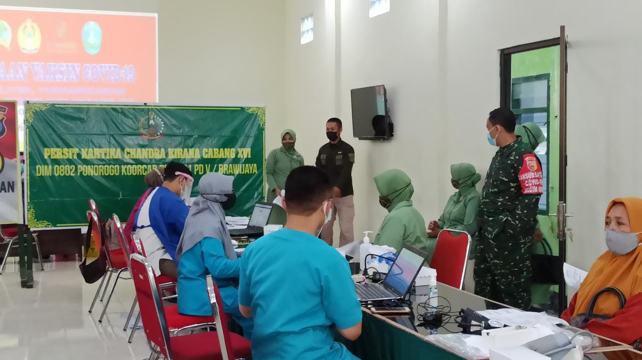 " Vaksinasi covid-19 yang digelar hari ini sudah kesekian kali kami laksanakan. Dan ini sesuai perintah Komando Atas dalam rangka mendukung kebijakan pemerintah dalam upaya mencegah dan memberantas covid-19 di Indonesia umumnya dan wilayah Ponorogo pada khususnya, " kata Dandim 0802/Ponorogo.