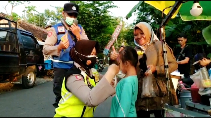 Ponorogo - beritaplus.id | Pandemi covid belum usai, guna menekan penularan virus Corona ,wujud kepedulian terutama kepada anak Polwan Polres Ponorogo IPDA Yayun setianingrum selaku Paur Humas polres ponorogo terus lakukan edukasi protokol kesehatan dengan cara bagi bagi masker.Rabu (19/5/2021)