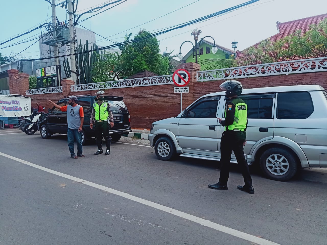 Terlihat anggota Satlantas Polres Ponorogo menertibkan kendaraan yang nekat parkir di sepanjang rambu larangan parkir di Jl. Dr. Soetomo Ponorogo.